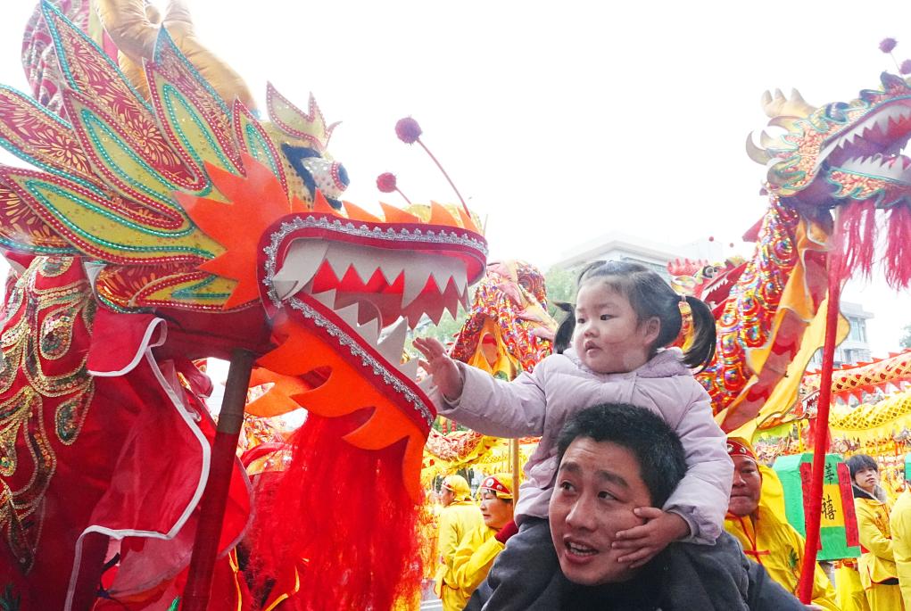3日、湖南省衡陽市衡山県の人民広場で、竜舞の竜頭に触れる子ども。(衡陽=新華社配信/曹正平)