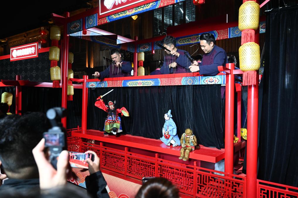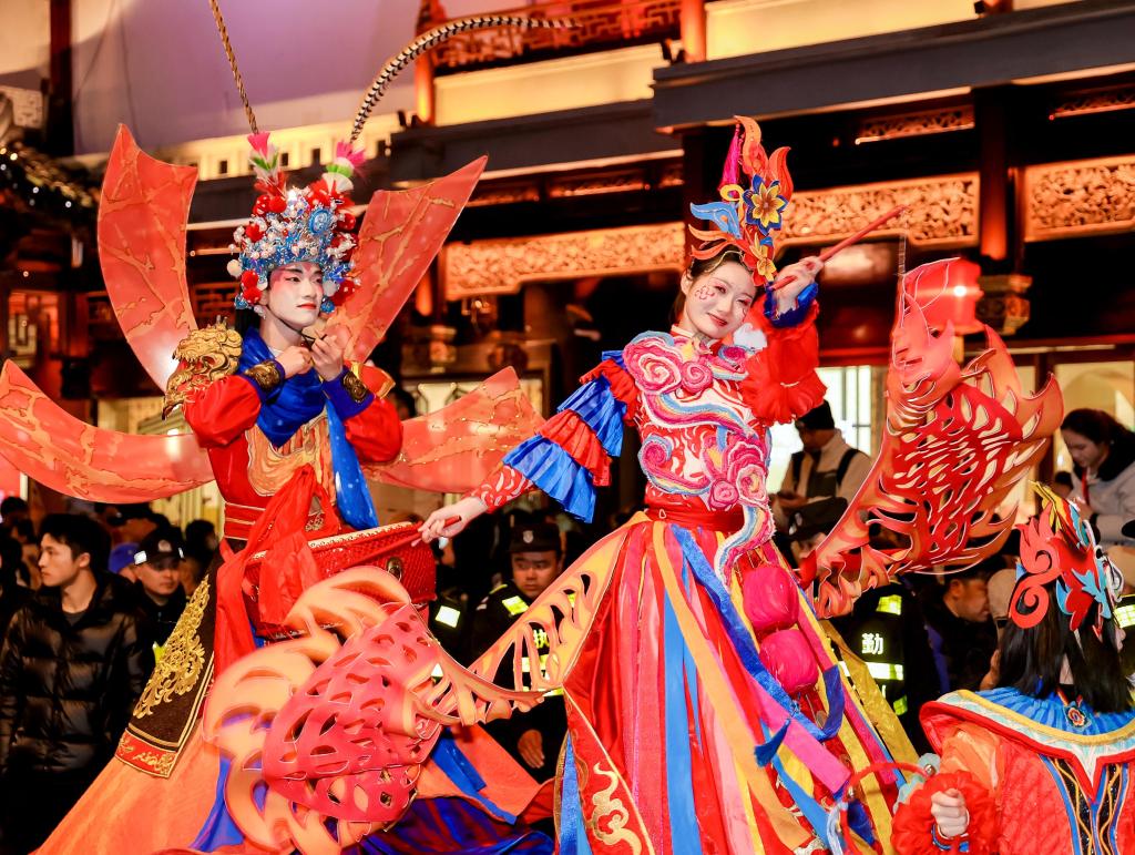 3日、上海市の豫園商城で披露された民俗パフォーマンス。(上海=新華社記者/劉穎)