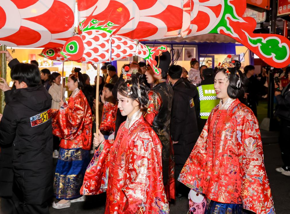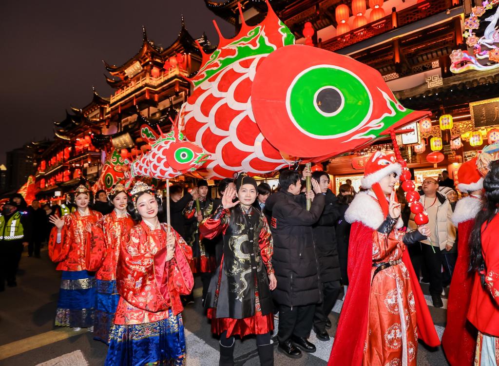 3日、上海の豫園商城で行われた「魚灯」(魚形ランタン)のパレード。(上海=新華社記者/劉穎)