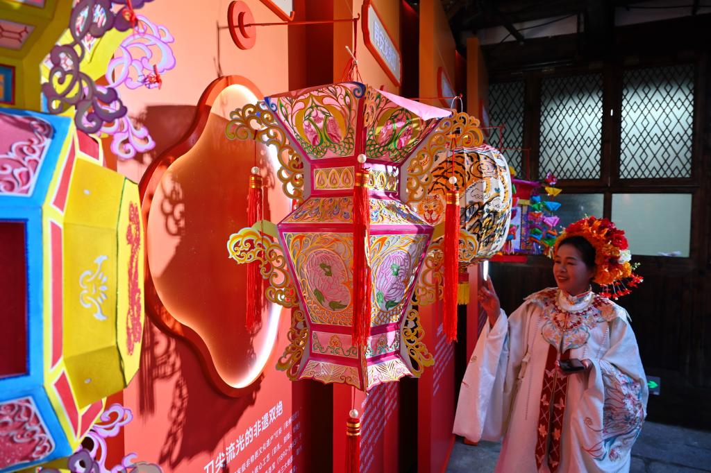 3日、福建省福州市の歴史文化街区「三坊七巷」で、飾りちょうちん「花灯」を見る人。(福州=新華社記者/林善伝)
