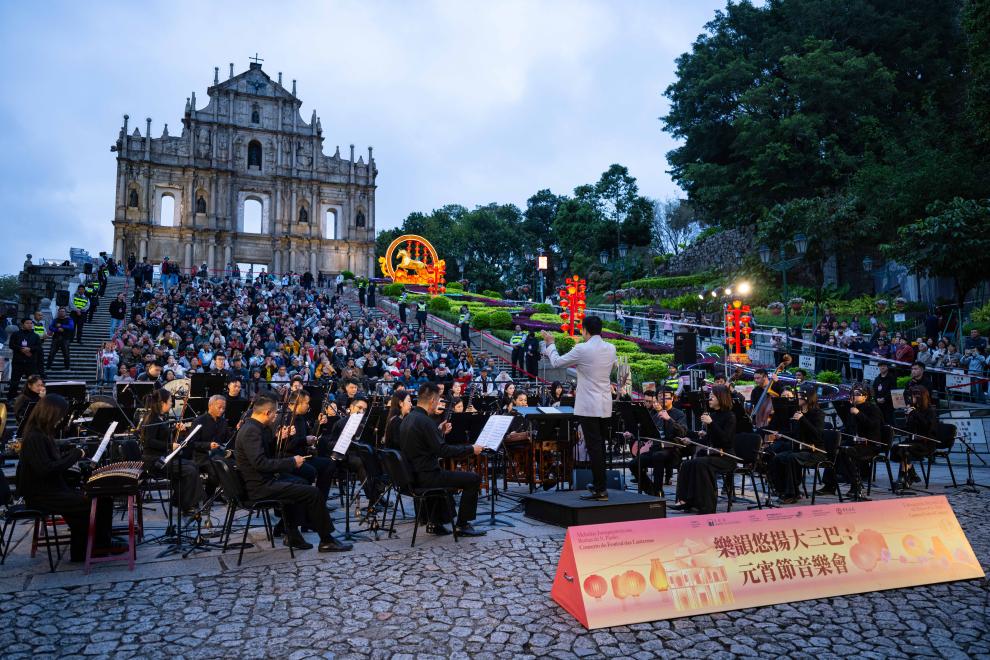 3日、マカオ特別行政区の聖ポール天主堂跡前で開かれた元宵節コンサート。(マカオ=新華社配信/張金加)
