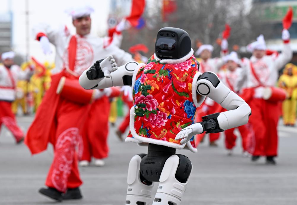 3日、新疆ウイグル自治区昌吉市で民俗行事「社火」を披露するロボット。(昌吉=新華社記者/王菲)