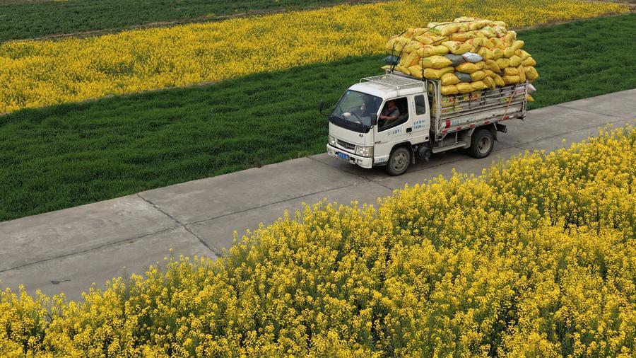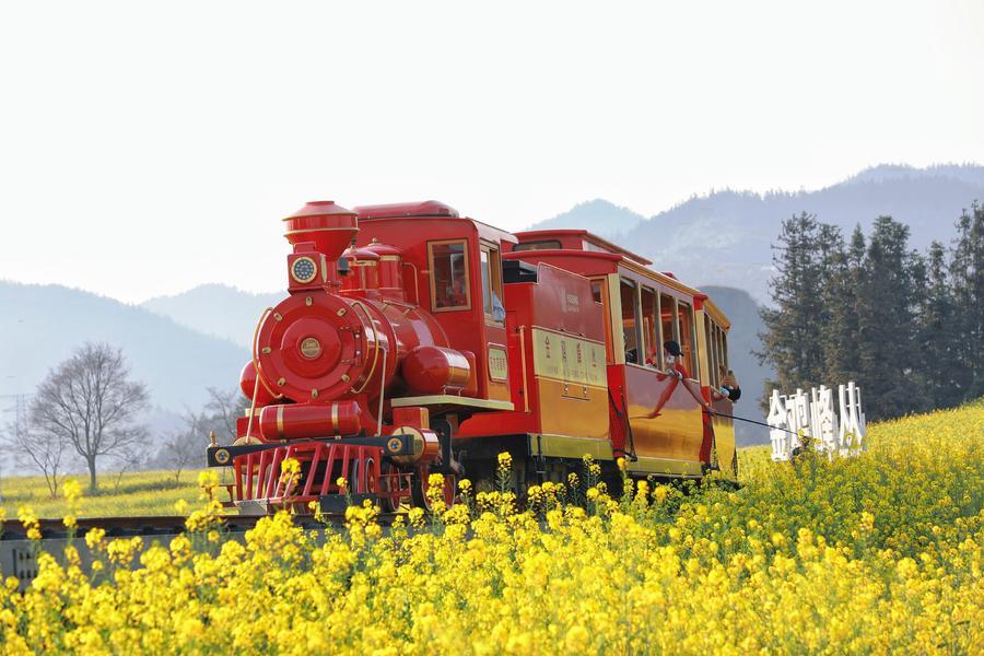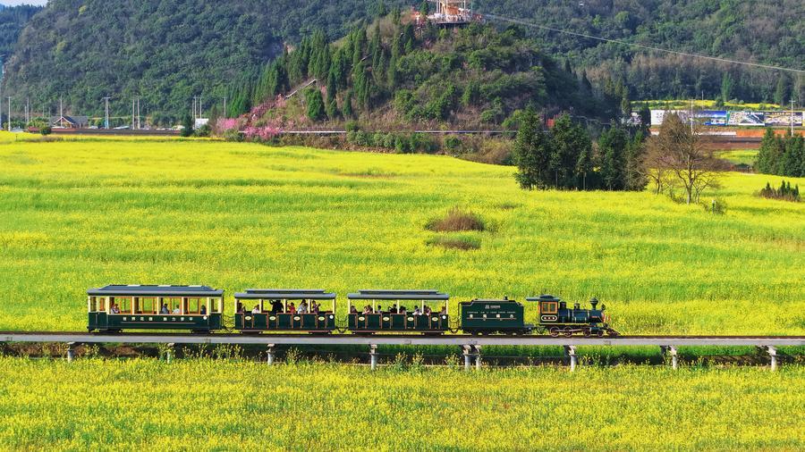2月27日、雲南省曲靖市羅平県の金鶏峰叢風景区で、菜の花畑を走る観光ミニ列車。(曲靖=新華社配信/楊紫軒)