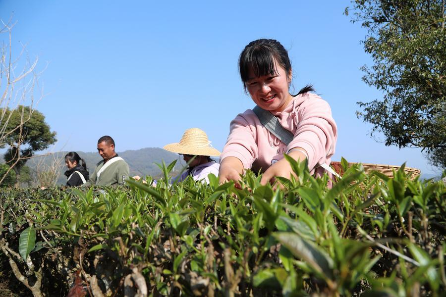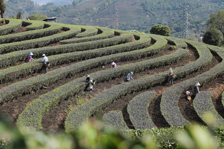 2月28日、雲南省普洱(ふじ)市寧洱ハニ族イ族自治県寧洱鎮の茶園で春茶を摘む人たち。(普洱=新華社配信/楊廷栄)
