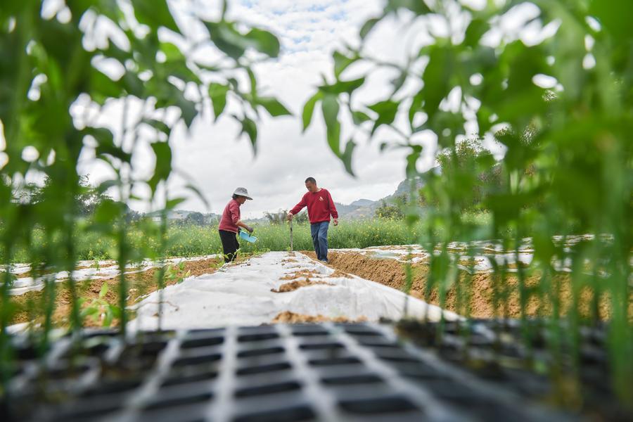 2月27日、雲南省文山チワン族ミャオ族自治州文山市の畑でショウガの植え付け準備をする地元住民。(文山=新華社配信/熊平祥)
