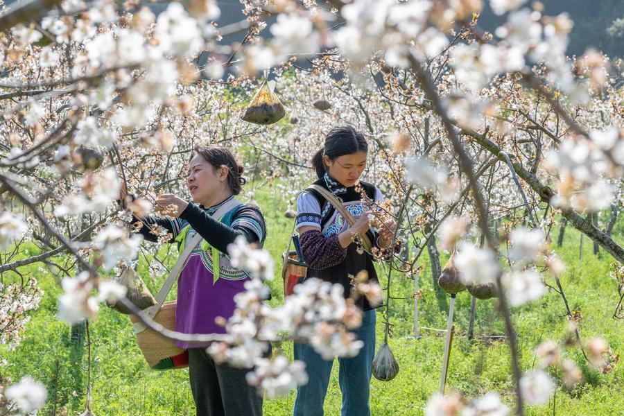 2月27日、雲南省文山チワン族ミャオ族自治州文山市のサクランボ畑で作業する地元住民。(文山=新華社配信/熊平祥)