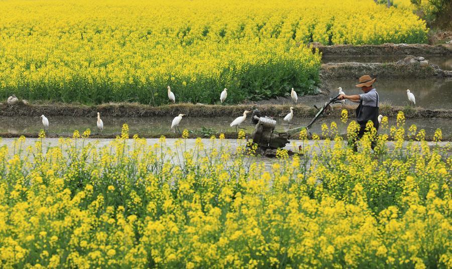 2月28日、雲南省騰沖市界頭鎮で水田を耕す農家の人。(騰衝=新華社配信/龔祖金)