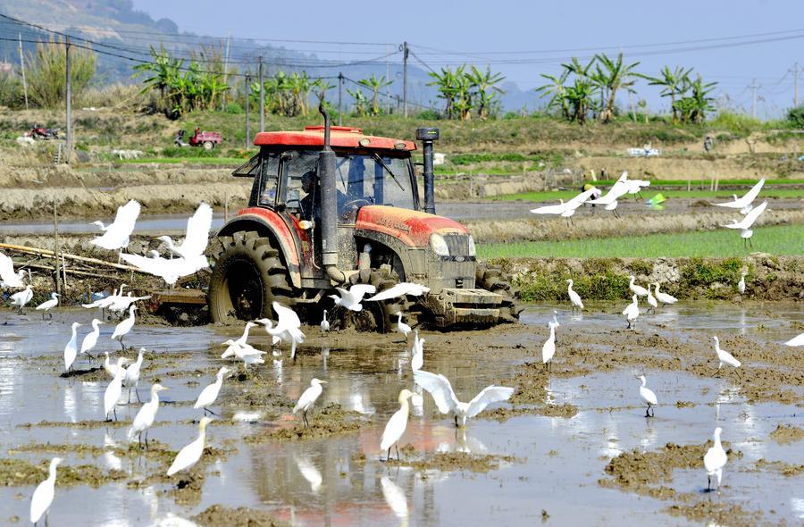 2月28日、雲南省西双版納(シーサンパンナ)ダイ族自治州勐海(もうかい)県勐混鎮で水田を耕すトラクター。(勐海=新華社配信/佐連江)