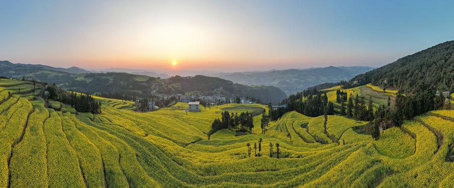 1日、雲南省曲靖市羅平県馬街鎮に広がる菜の花畑。(パノラマ写真、曲靖=新華社配信/楊俊鵬)