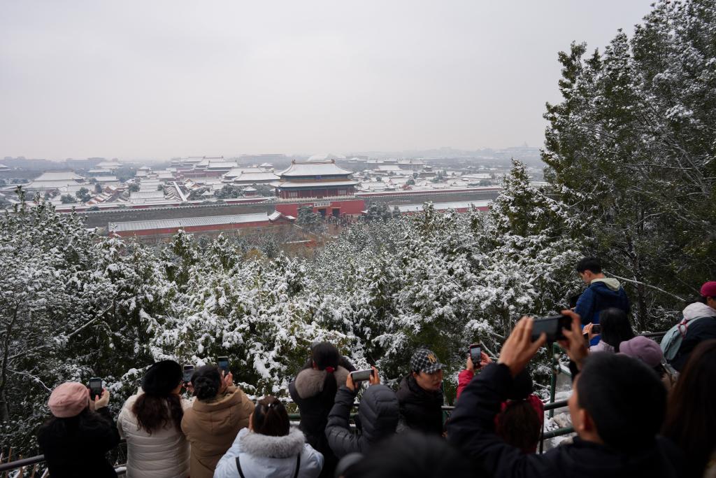 5日、景山公園で雪景色を楽しむ人たち。(北京=新華社記者/謝晗)