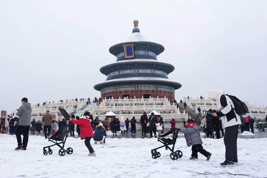 5日、雪化粧した天壇公園を見学する観光客。(北京=新華社記者/鞠煥宗)