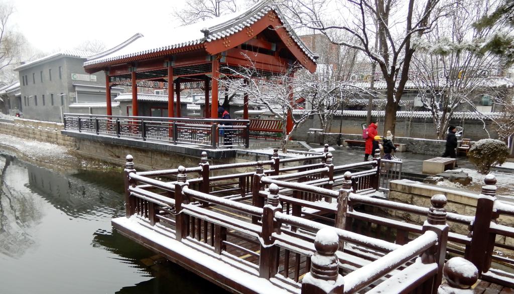 5日、北京市東城区を流れる玉河の雪景色。(北京=新華社記者/李欣)