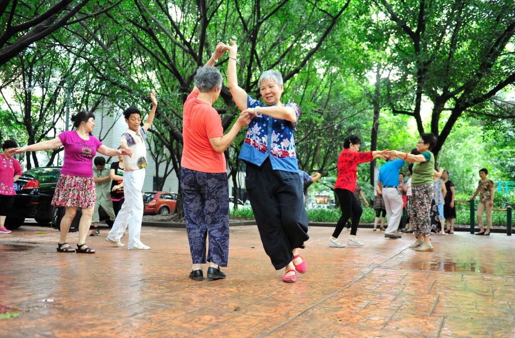 重慶市南岸区にある広場でダンスを楽しむ高齢者。(2025年7月撮影、重慶=新華社配信)