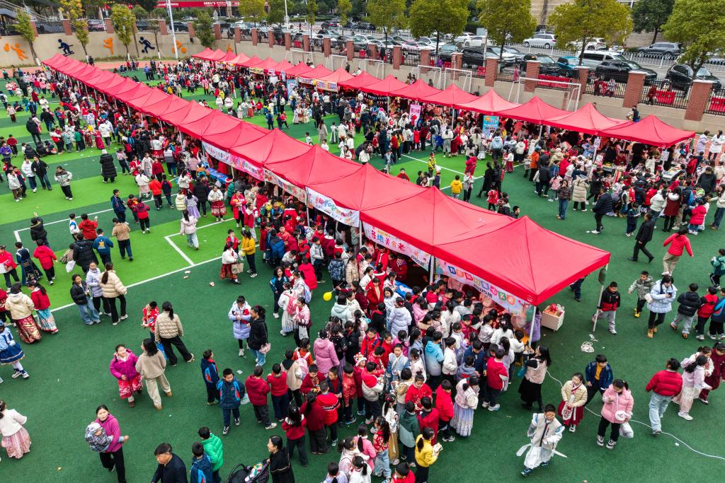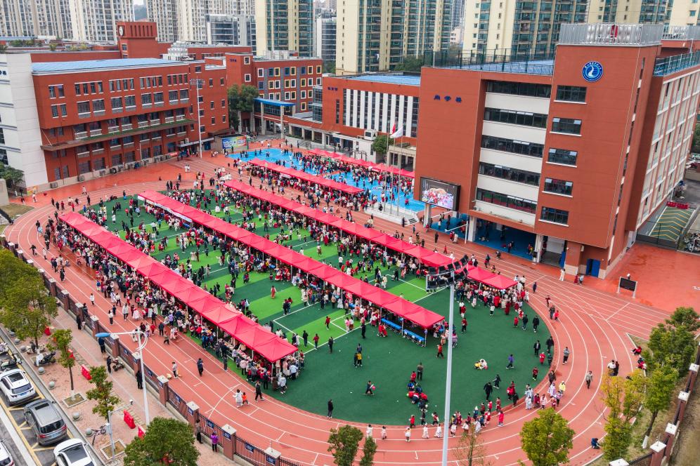 4日、麓山国際実験小学校で行われたチャリティーバザーの様子。(ドローンから、長沙=新華社記者/陳思汗)