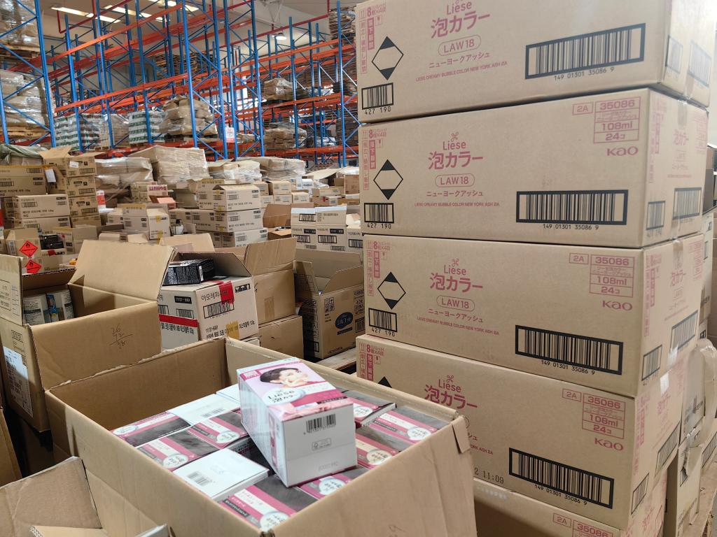 山東省の煙台総合保税区西エリアにある日韓消費財越境ECセンターの格派菜鳥保税倉庫内に保管された日本の製品。(2月5日撮影、煙台=新華社記者/邵琨)