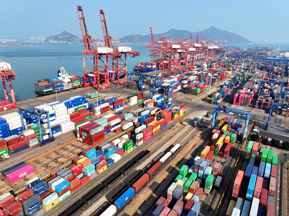 江蘇省連雲港港のコンテナ埠頭にある積み下ろし作業エリア。(1月28日、ドローンから、連雲港=新華社配信/王春)