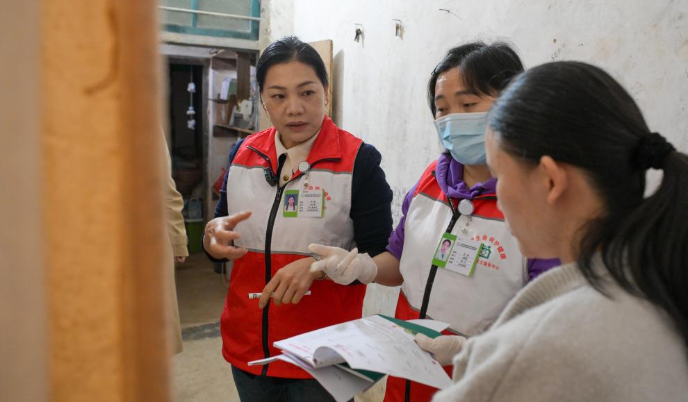 海南省白沙リー族自治県牙叉鎮の住民に無料診療を行う韋小麗さん(左)。(2月3日撮影、白沙=新華社記者/楊冠宇)
