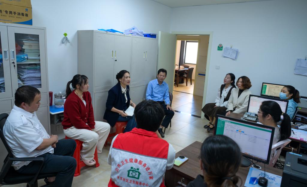 海南省白沙リー族自治県の衛生サービスセンターで、同僚らの意見を聞く韋小麗さん(左から3人目)。(白沙=新華社記者/楊冠宇)