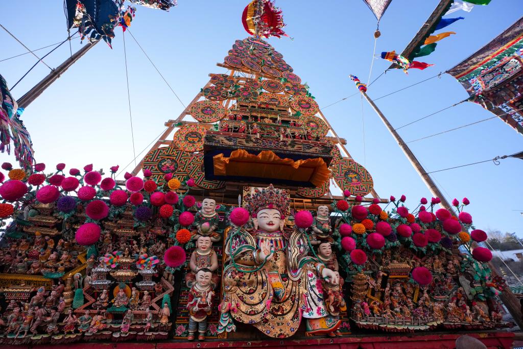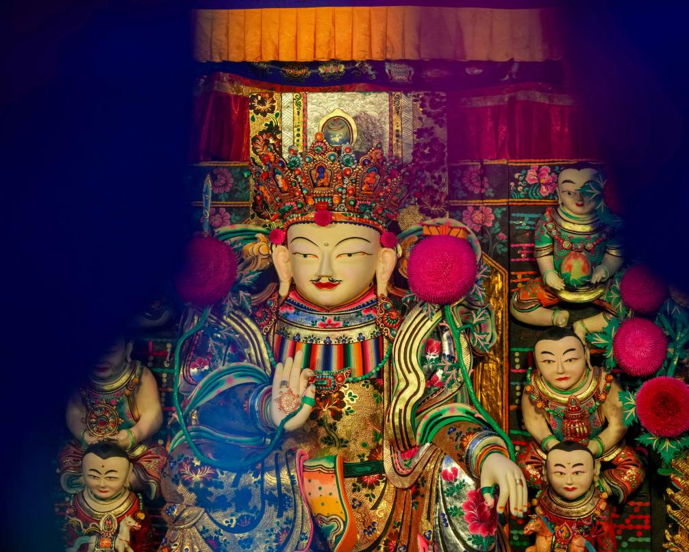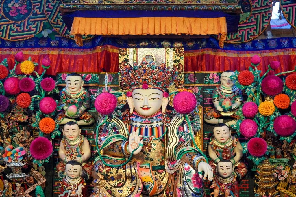 寺の芸術僧がバターをこね精緻な彫刻を施して作る酥油花は、壁画、立体刺しゅう「堆繡(ドゥイシュウ)」と並び同寺の「三大芸術」と称されている。