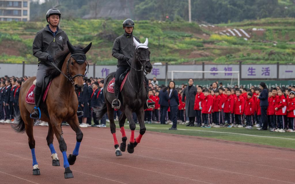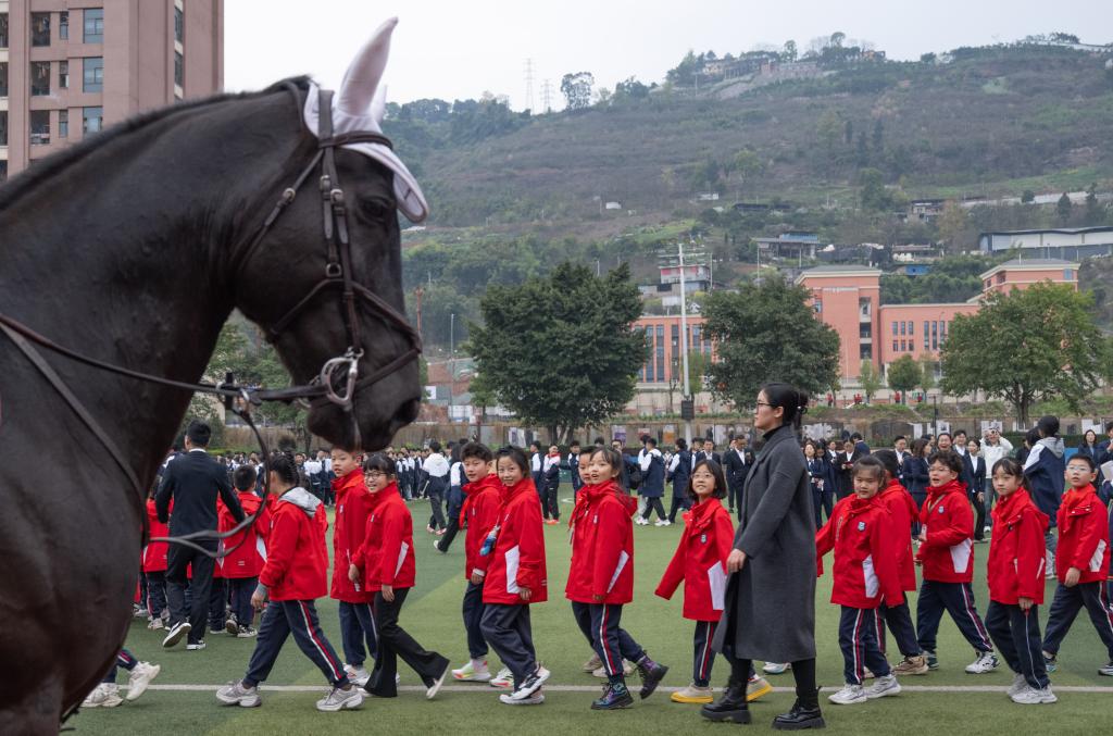 5日、馬に迎えられた南城巴川中学の生徒たち。(重慶=新華社記者/陳誠)