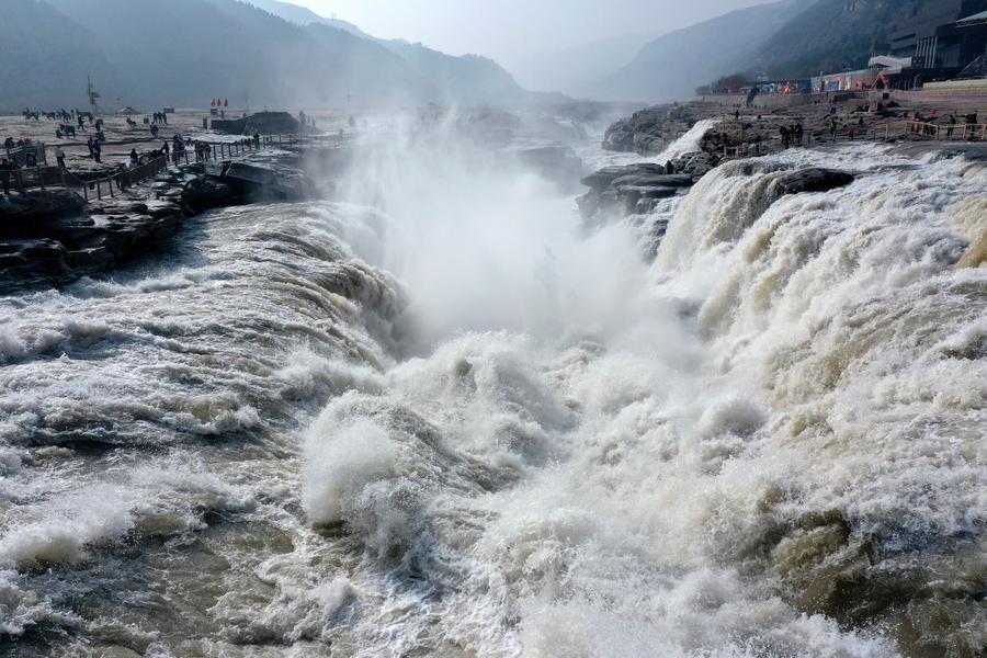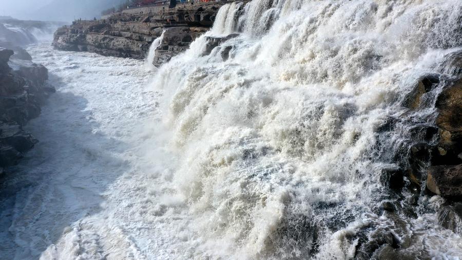 【新華社臨汾3月8日】中国山西省臨汾市吉県と陝西省延安市宜川県の境に位置する黄河壺口瀑布はこのほど、気温の上昇に伴って上流の氷が解け、水量が増加している。