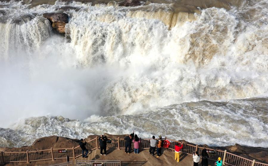 5日、水量が増加した黄河壺口瀑布。(ドローンから、臨汾=新華社配信/呂桂明)