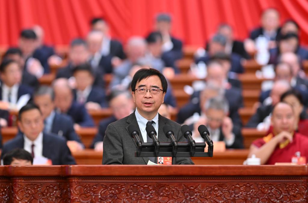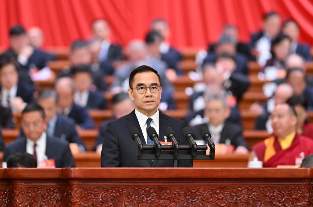 8日、「香港が国家の発展大局に深く融合し、貢献できるよう積極的に推進」と題した発言を行う施栄懐(し・えいかい)委員。(北京=新華社記者/岳月偉)