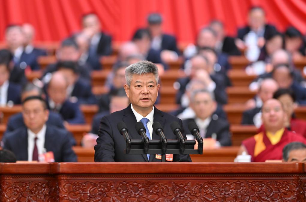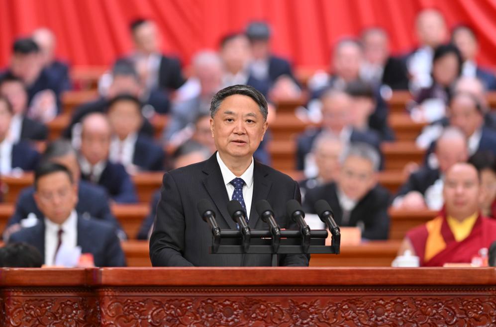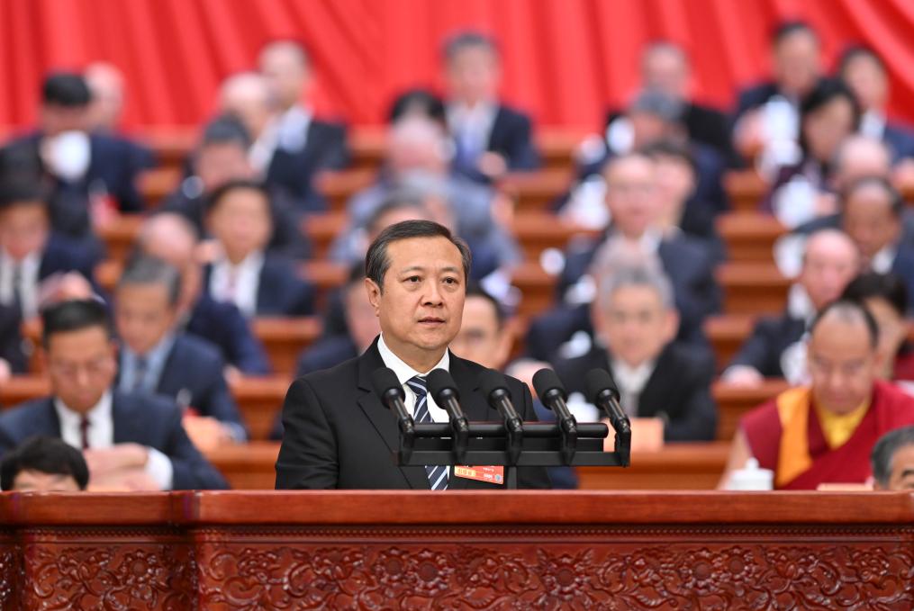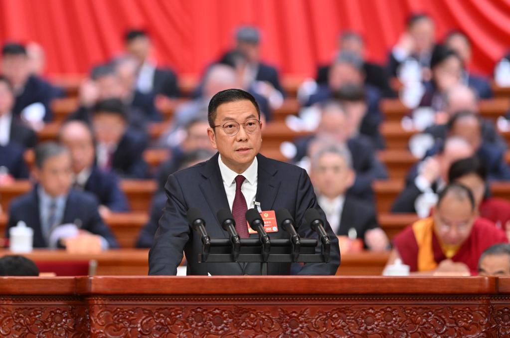 8日、「新型エネルギー体系の構築加速、エネルギー・資源の安全保障能力の向上」と題した発言を行う温枢剛(おん・すうごう)委員。(北京=新華社記者/張領)