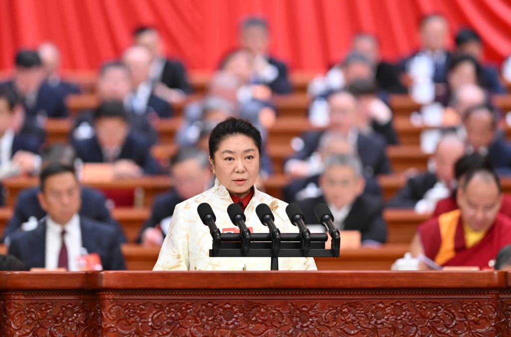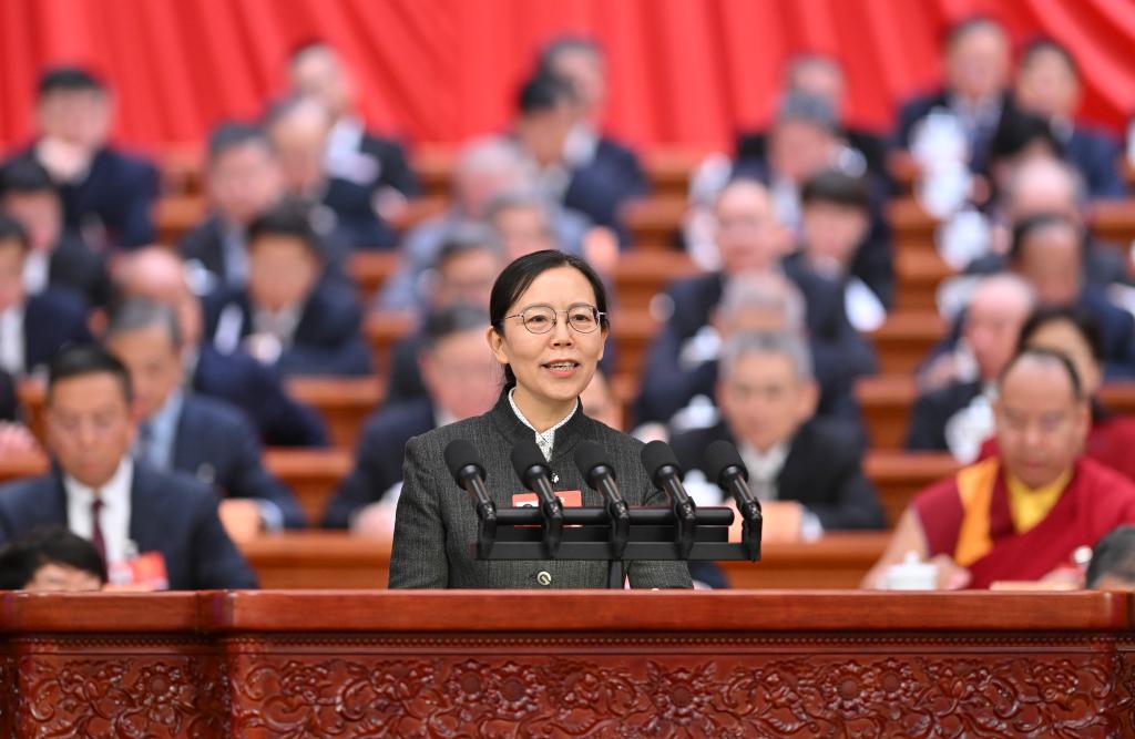 8日、「『千万プロジェクト』(千のモデル村で万の村を整備)で都市と農村の融合発展けん引、全人民の共同富裕に向けた着実な一歩を推進」と題した発言を行う廉毅敏(れん・きびん)委員。(北京=新華社記者/岳月偉)