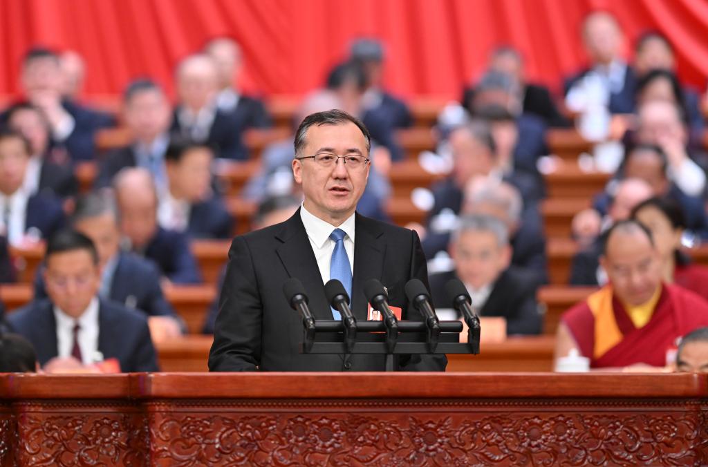 8日、「新時代・新征途における中華民族共同体構築の積極的推進」と題した発言を行う伊力扎提・艾合買提江委員。(北京=新華社記者/張領)