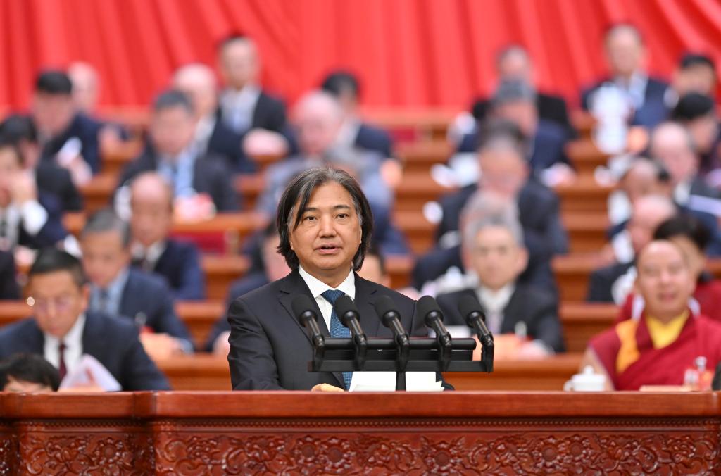 8日、「宗教の社会主義社会への適応を積極的に推進、中華民族の偉大な復興に貢献」と題した発言を行うパンチェン・エルデニ・チューキギャルポ委員。(北京=新華社記者/岳月偉)