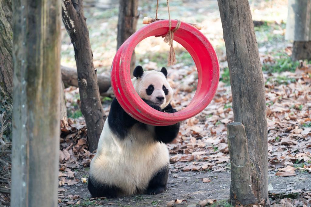 遊具で遊ぶ福宝。(1月12日撮影、成都=新華社配信/Panda365提供)