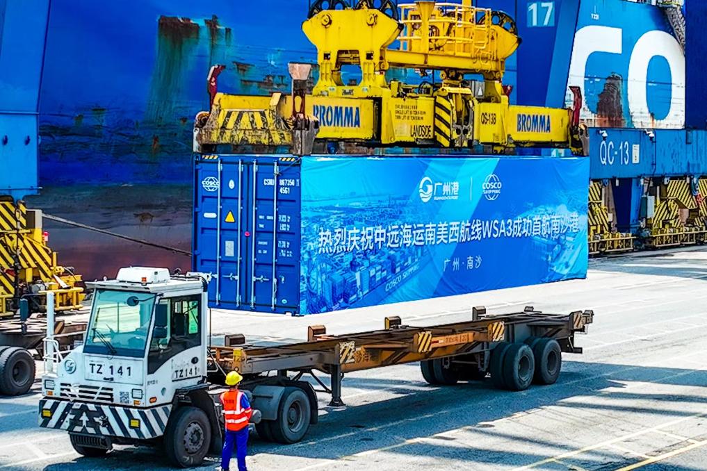 広州港初の南米西海岸直航ルート「WSA3」の開通初日に、貨物船に積まれるコンテナ。(2025年4月29日撮影、広州=新華社配信)
