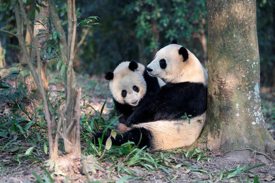 【新華社成都3月8日】中国四川省のパンダ保護研究センター臥竜神樹坪基地で、米国から返還されたパンダの「珍珍(ジェンジェン)」が「芊喜(チエンシー)」を連れて木のそばで遊ぶ様子が撮影された。