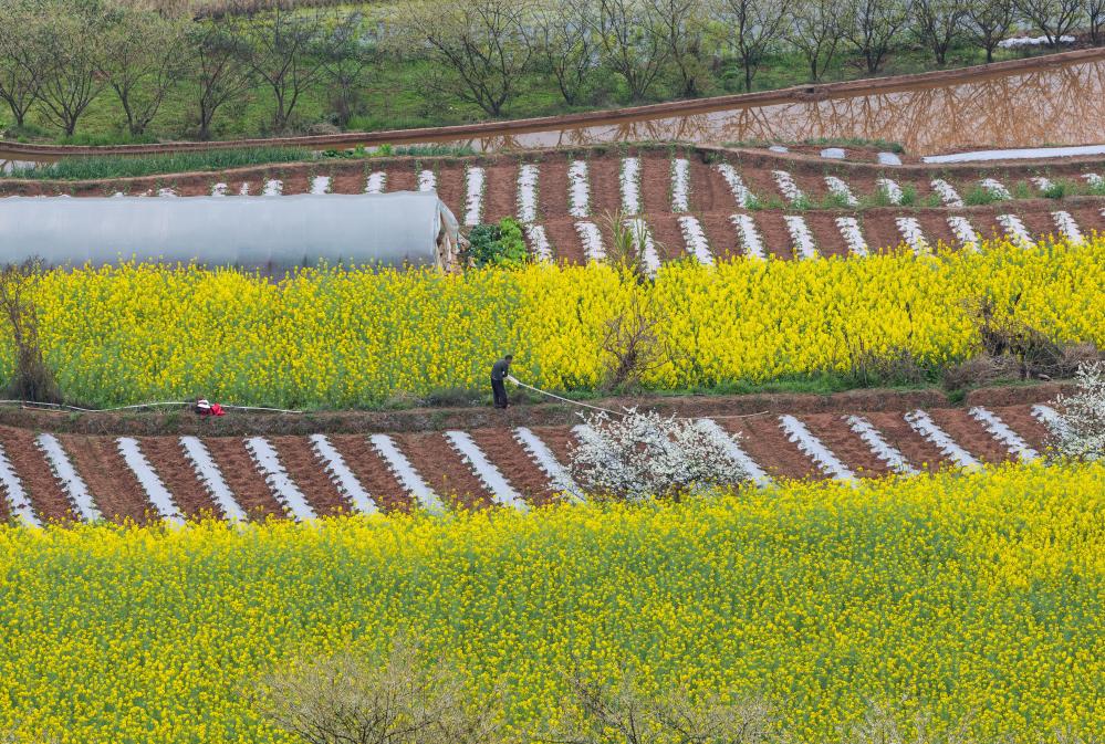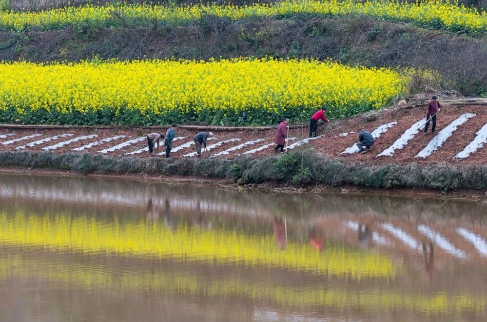 【新華社自貢3月9日】中国四川省自貢市栄県の天宮廟村で春の農作業の準備が始まった。人々は地面を農業用シートで覆い、トウガラシを植えている。村は鉄分を多く含む泥質砂岩を主体とした土壌で知られ、菜の花などの鮮やかな色が赤褐色の大地を彩っている。
