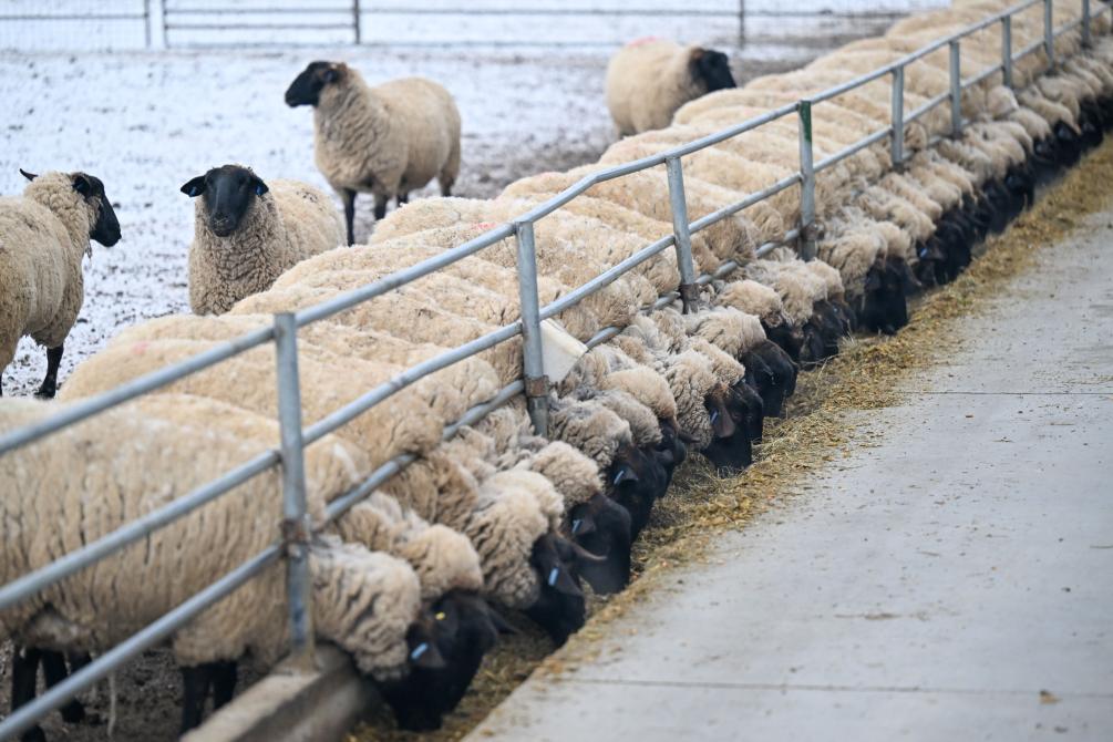 3日、新疆ウイグル自治区昌吉回族自治州の牧畜企業、日発新西域瑪納斯牧業で飼育されるサフォーク羊。(ウルムチ=新華社記者/丁磊)