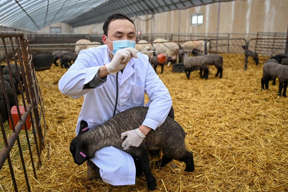 3日、新疆ウイグル自治区昌吉回族自治州の牧畜企業、日発新西域瑪納斯牧業で子羊の体温を測定する従業員。(ウルムチ=新華社記者/丁磊)