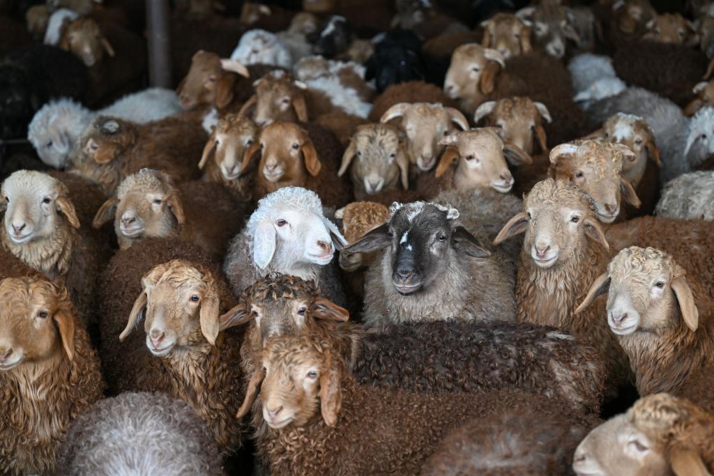 3日、新疆ウイグル自治区昌吉回族自治州マナス県旱卡子灘カザフ族郷で飼育される子羊。(ウルムチ=新華社記者/丁磊)