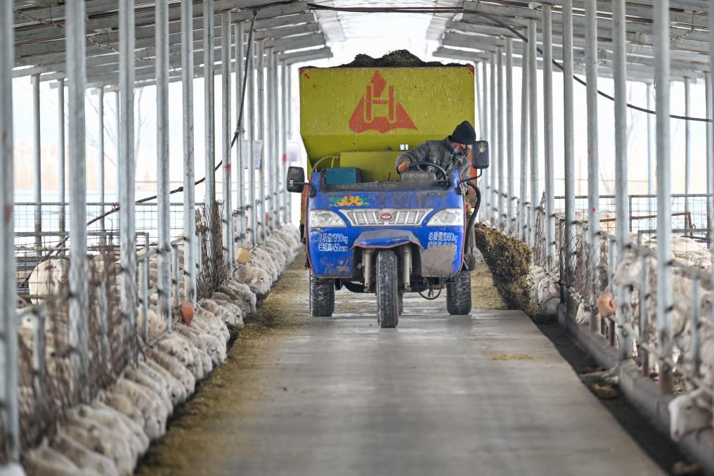 3日、新疆ウイグル自治区昌吉回族自治州の牧畜企業、日発新西域瑪納斯牧業で自動散布車で飼料を与える従業員。(ウルムチ=新華社記者/丁磊)