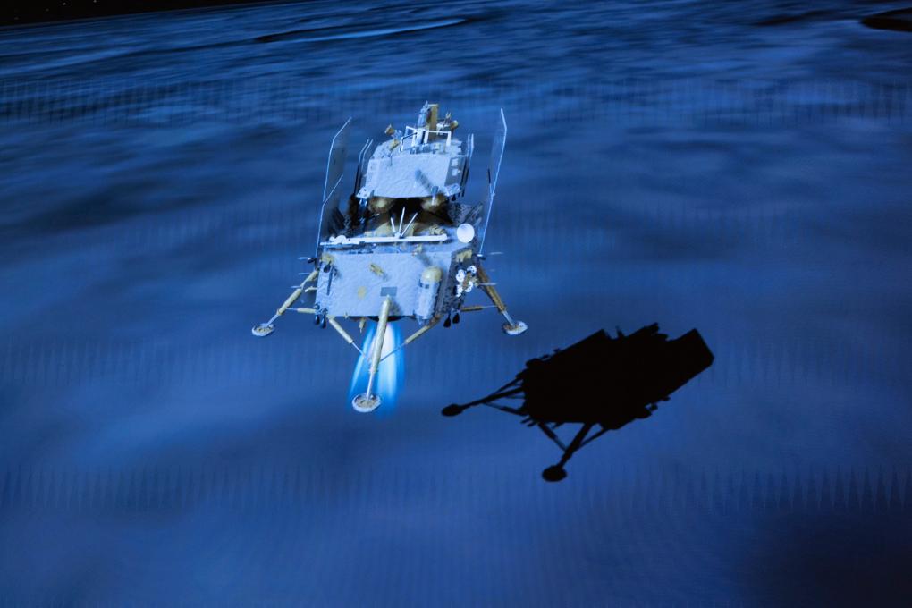 「嫦娥6号」の着陸機と上昇機の結合体が月の裏側に着陸するシミュレーション画像。(2024年6月2日、北京航天飛行制御センターのモニター映像、北京=新華社記者/金立旺)