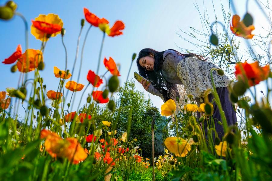 10日、昆明市の観光農園「名花谷」でヒナゲシの花を撮影する人。(昆明=新華社記者/陳欣波)