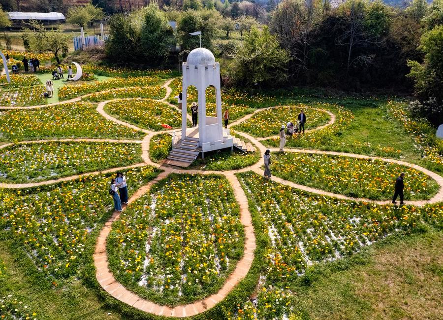 10日、昆明市の観光農園「名花谷」を散策する人たち。(ドローンから、昆明=新華社記者/陳欣波)