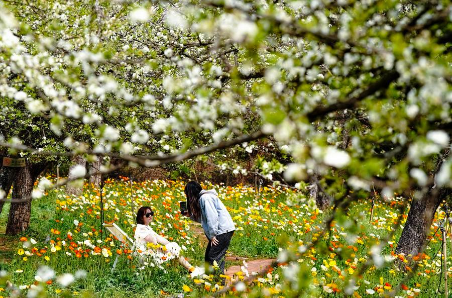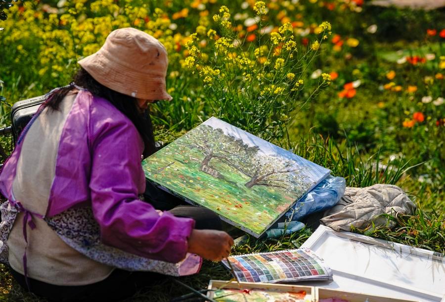 10日、昆明市の観光農園「名花谷」で写生をする人。(昆明=新華社記者/陳欣波)