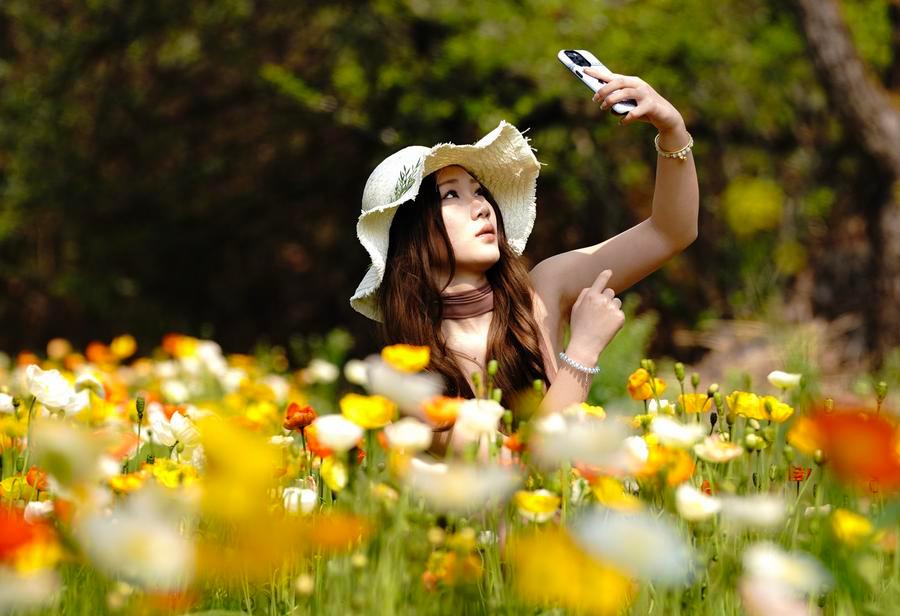 10日、昆明市の観光農園「名花谷」のヒナゲシ畑で写真を撮る人。(昆明=新華社記者/陳欣波)
