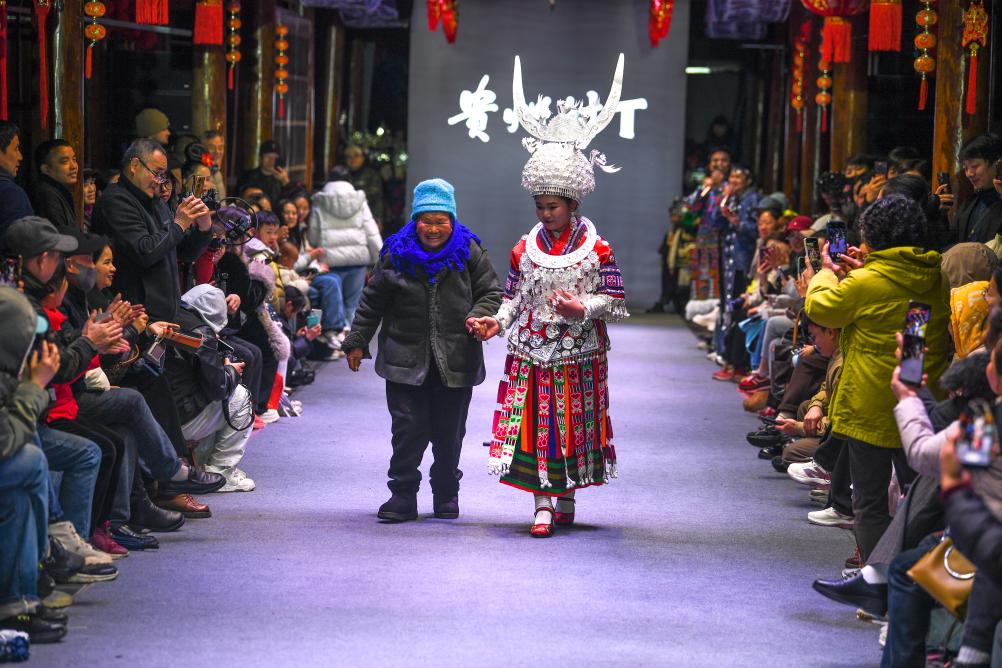 8日、凱里市で開かれた民族衣装ファッションショー「村T」で、祖母と一緒にランウェイを歩くミャオ族の女性。(凱里=新華社記者/楊文斌)