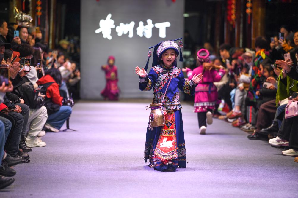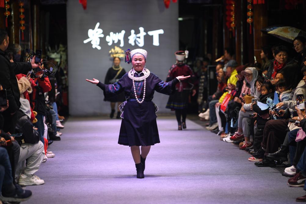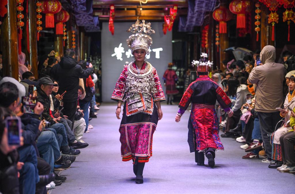 【新華社凱里3月11日】中国貴州省黔東南(けんとうなん)ミャオ族トン族自治州凱里市の「苗(ミャオ)侗(トン)風情園」で8日、民族衣装のファッションショー「村T」が開かれた。自治州内16の県・市の女性代表がランウェイを歩き、民族衣装の多彩な美しさを披露した。