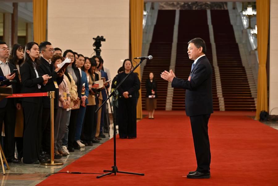 12日、「部長通路」で取材を受ける賀栄司法部長。(北京=新華社記者/王曦)