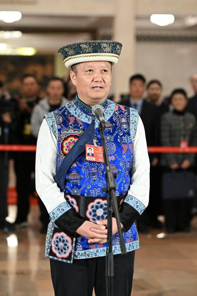 12日、取材を受ける全人代代表の王国棟(おう・こくとう)氏。(北京=新華社記者/程婷婷)