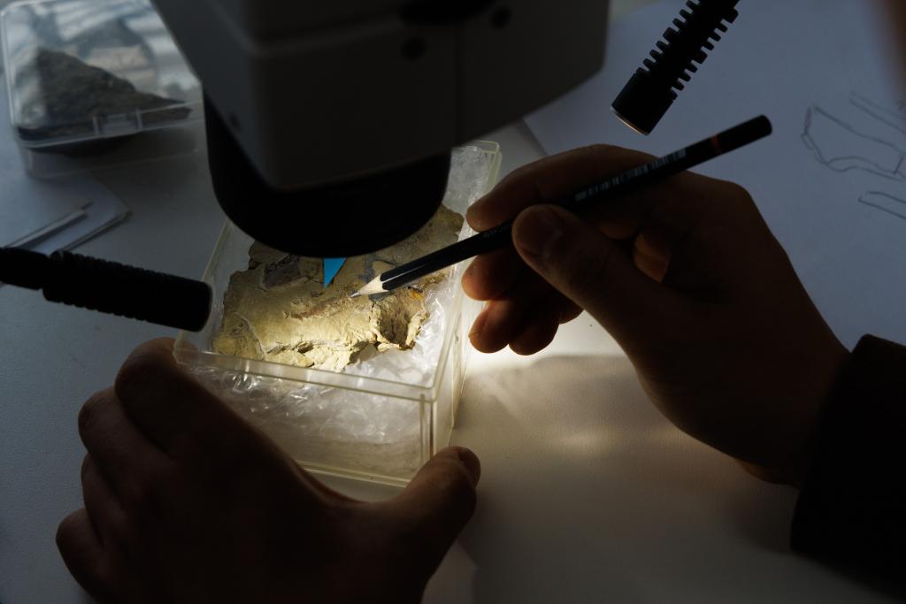 3日、中国科学院古脊椎動物・古人類研究所のオフィスで、重慶始骨魚(Eosteus chongqingensis)の化石を研究する朱幼安(しゅ・ようあん)研究員。(北京=新華社記者/金立旺)