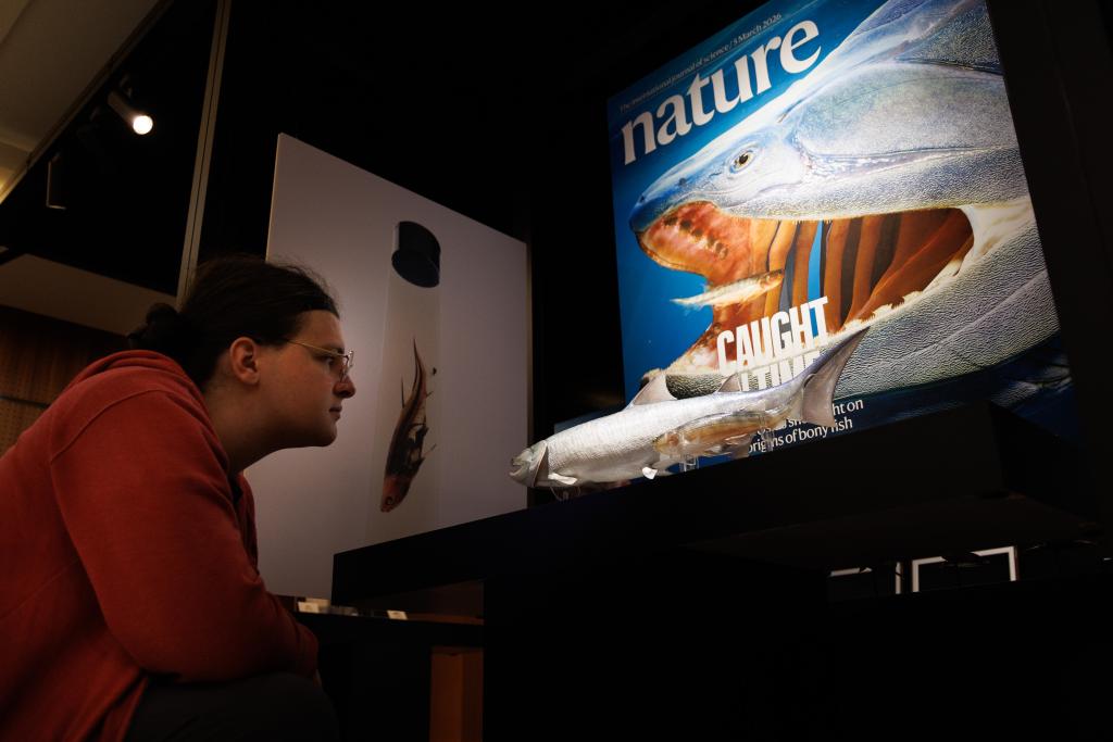 3日、中国科学院古脊椎動物・古人類研究所で開かれた記者発表会で、重慶始骨魚(Eosteus chongqingensis、左)と鈍歯宏顎魚(Megamastax amblyodus)の復元模型を並べる職員。(北京=新華社記者/金立旺)